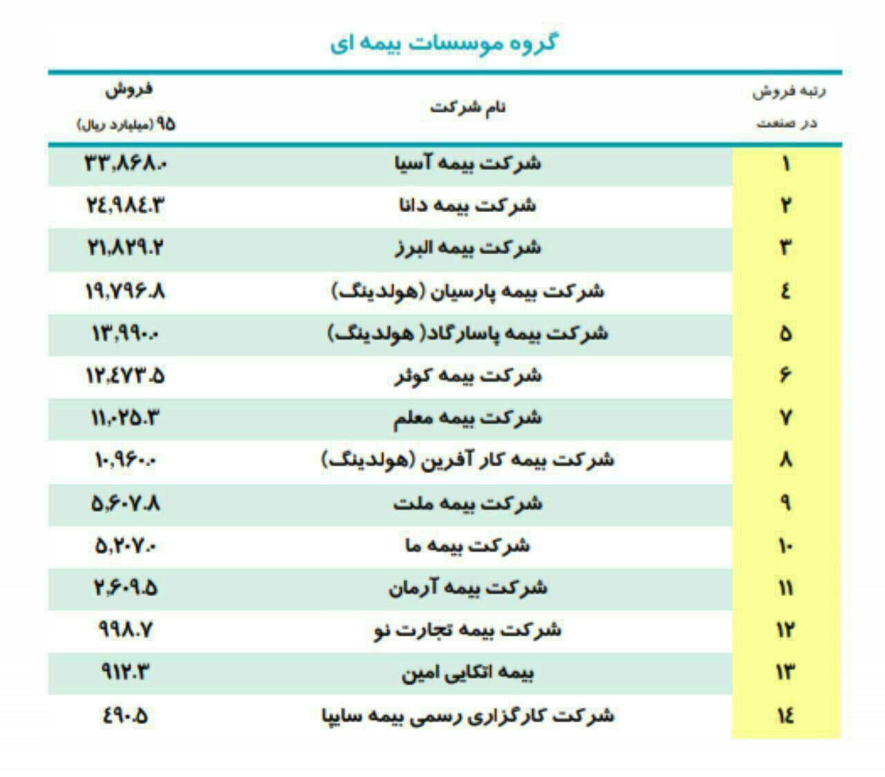 بنابر این گزارش ، بیمه آسیا به عنوان بزرگ ترین بیمه خصوصی کشور،حائز رتبه اول گروه موسسات بیمه ای شرکت های برتر ایران در چهار سال متوالی1393،1394،1395،1396و دارا بودن بیش از یکصد شعبه و سه هزار نمایندگی در سراسر کشور، در تمامی بیست سال رتبه بندی شرکت های برتر ایران در بین صد شرکت برتر کشور قرارداشته است.